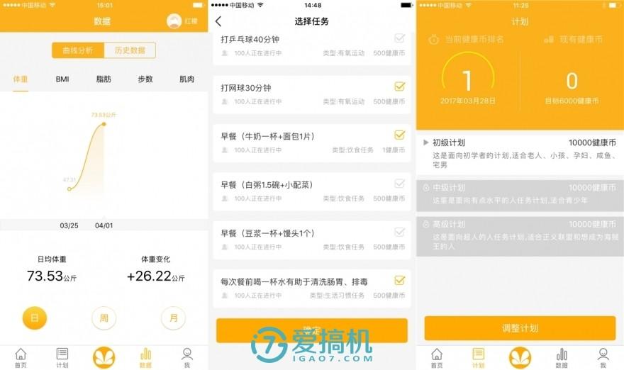 除了能够查看健康数据之外,还可以设定一系列的减肥、增重和保持体重等计划,每个计划里面都有相应的任务,提供一些瘦身减脂的办法和饮食小技巧,很是贴心,一共分为初级、中级和高级三个水平,在完成每个任务之后,还可以得到健康币,虽然不能用这货币来做什么,但这其实是一个很好的激励方法,因为你会发现,随着健康币的增加,你的体重、体脂也会随之下降。