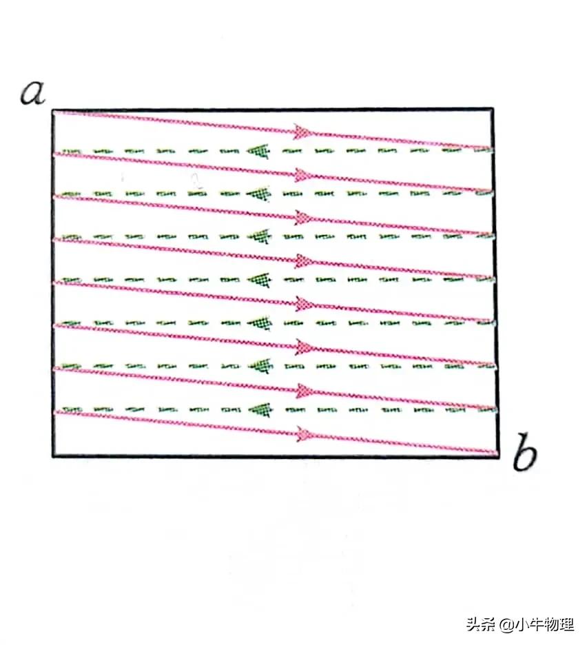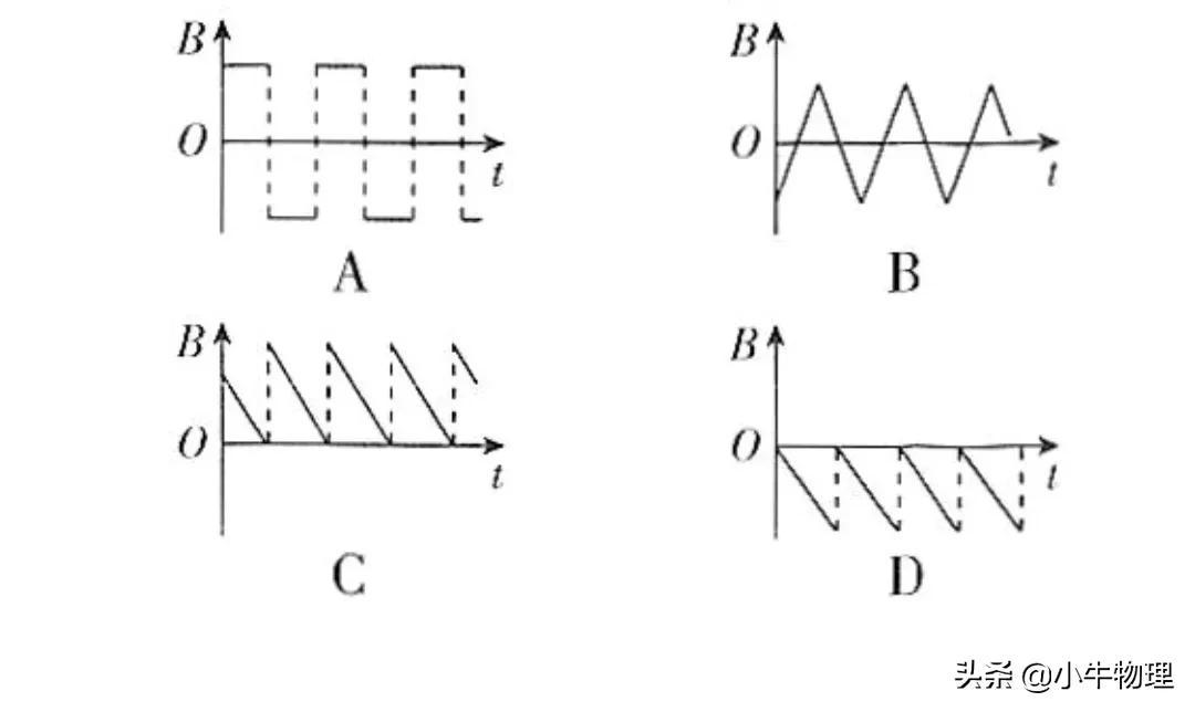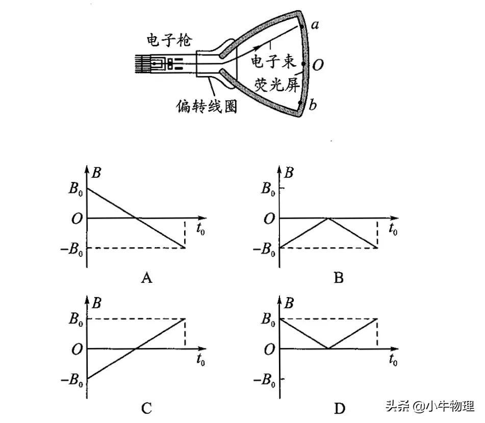 例题:显像管原理的示意图如图所示,当没有磁场时,电子束将打在荧光屏正中的点,安装在管径上的偏转线圈可以产生磁场,使电子束发生偏转。设垂直于纸面向里的磁场方向为正方向,若使高速电子流打在荧光屏上的位置由a点逐渐移动到b点,如图所示的变化磁场中,能够使电子发生上述偏转的是(C).