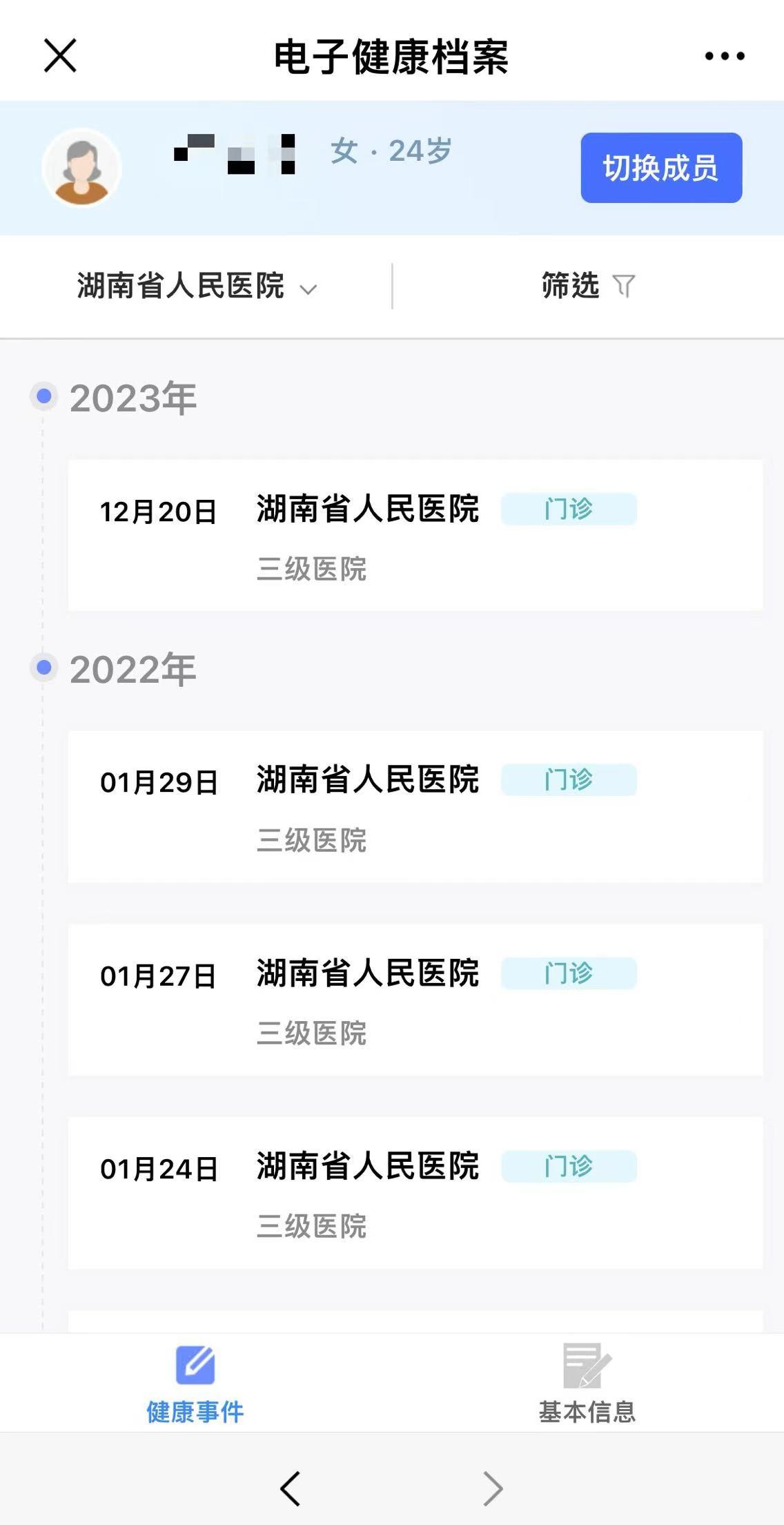 新版湖南省居民健康卡的另一亮点是,为每一位市民建立了电子健康档案。记者通过人脸认证初次申领后进入电子健康档案页面,可以查看2023年12月、2022年1月在湖南省人民医院门诊,2022年1月在社区卫生服务中心的就医记录。