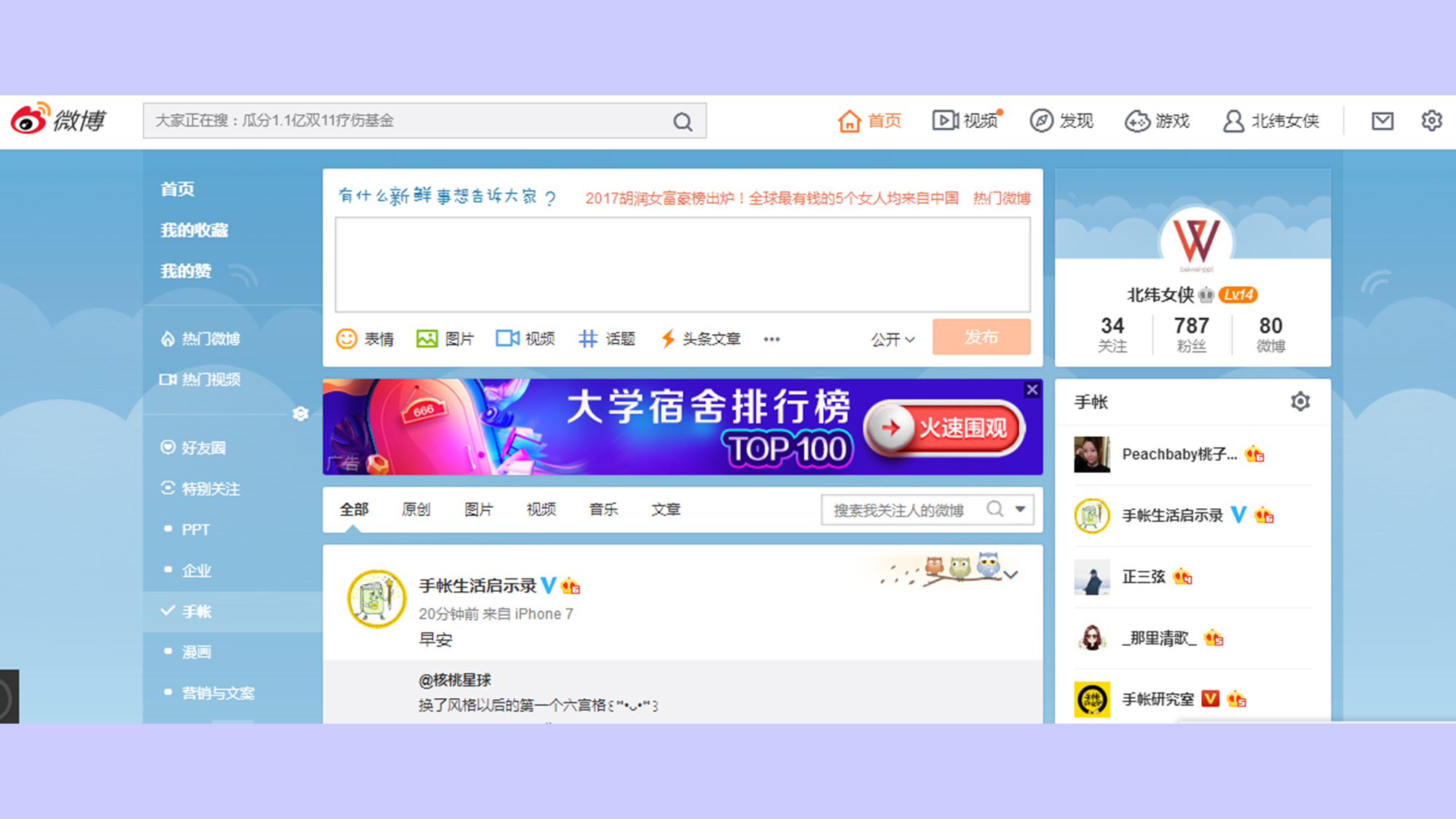 微博最常见啦,在上面搜索“手帐”“简笔画”等关键字就能找到很多手帐博主、手帐素材、简笔画等等~一个小技巧是,先找到一个博主,通过他关注的人以及在他发的微博里就能找到很多相关的博主啦~比如搜索@手帐研究室试试?