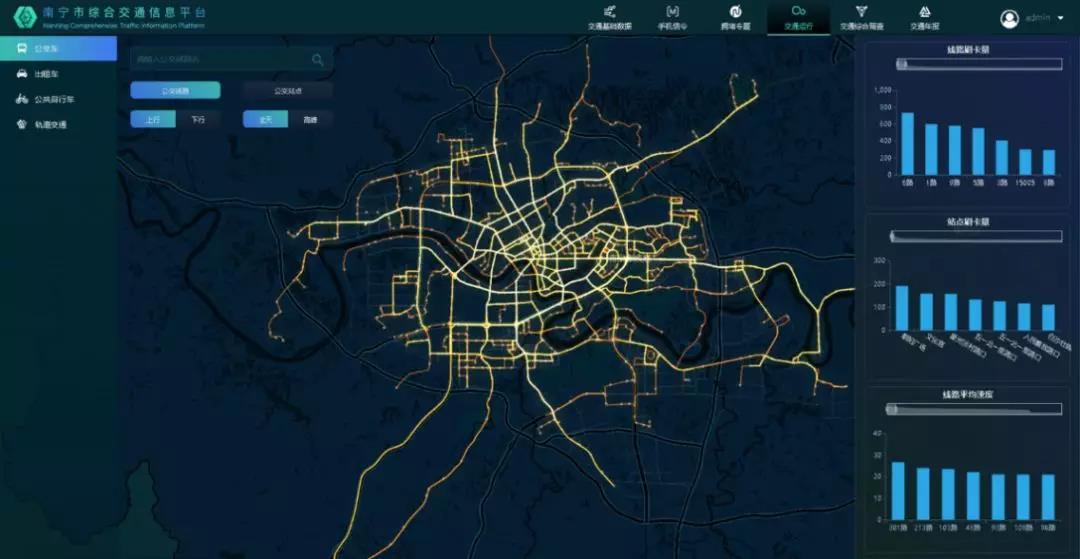 除此之外,借助大数据的空间可视化技术,各类规划成果都能聚在一张地图上,能很清楚地提取查看,并清晰地知晓多个规划行为之间的关系。在提供基础数据同时,还能提供各类有效的业务专题数据,辅助规划编制。例如,通过展示公交车刷卡线路、站点刷卡情况,结合人口分布等其他信息,能够分析公交线路规划是否合理、哪里需要增加站点,为城市规划提供决策支持,如图4所示。