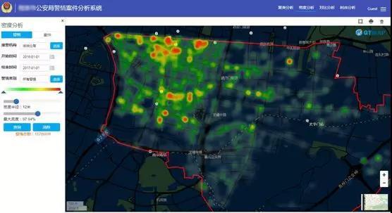 大数据GIS在公安行业的应用主要依托云GIS技术、分布式存储技术、流数据处理技术,将基础地理信息库与带有时空信息的公安专题数据库进行融合,为各个警种的业务开展提供更高效的地理信息服务。例如,使用流数据处理技术能够实现对实时监控数据的传输、地理围栏构建及轨迹重建,如图5所示,某市公安局警情案件分析系统展示实时警情密度分布,可为警力资源的指挥调度提供指导。