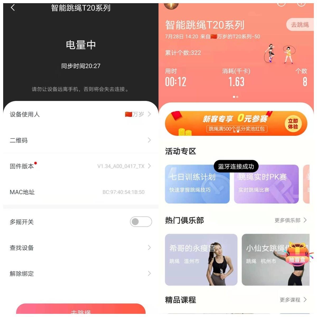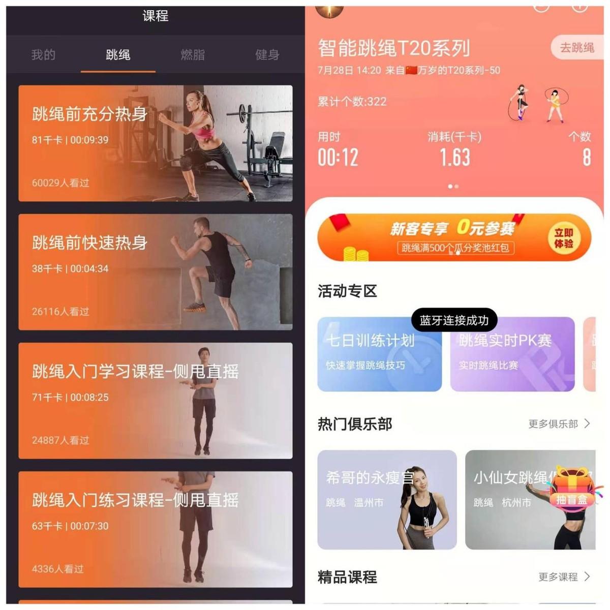 在使用上面,两者都有配套app,在app中,两者的运行机制都差不多,都需要让跳绳和手机连接,连接方式都是蓝牙,数据都可以同步到app端,但两者在使用细节方面,还是有些许的差别。