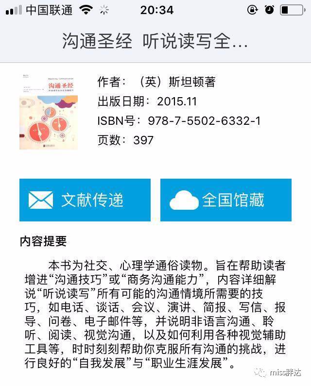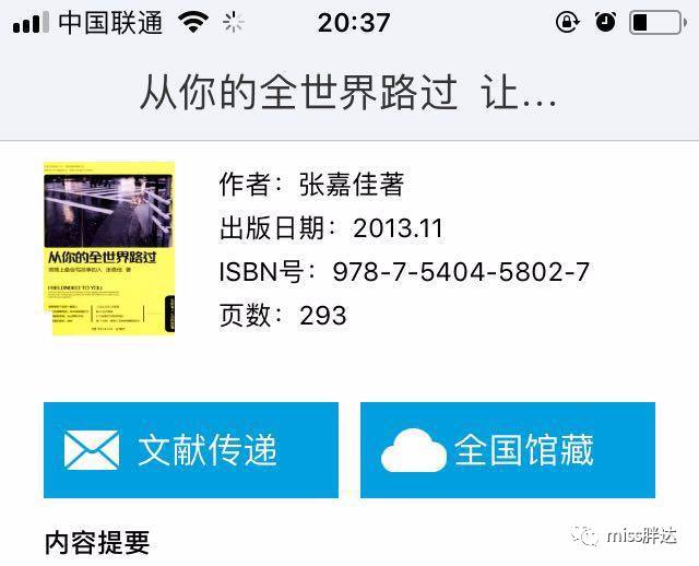 分为图书、章节、期刊、报纸、视频等,基本就是图书馆那一套。我只搜图书,它对接的是各级省市图书馆的馆藏。资源还算丰富,除了特别新的书或脱销的书,很多书都能找到。随机搜了几本,《岛上书店》、《沟通圣经》、《从你的全世界路过》都有,但是像《三体》、《人类简史》这种就没找到。总之它就是一个线上图书馆,资源偏经典,偏公益,毕竟它是一个图书馆而不是书城。