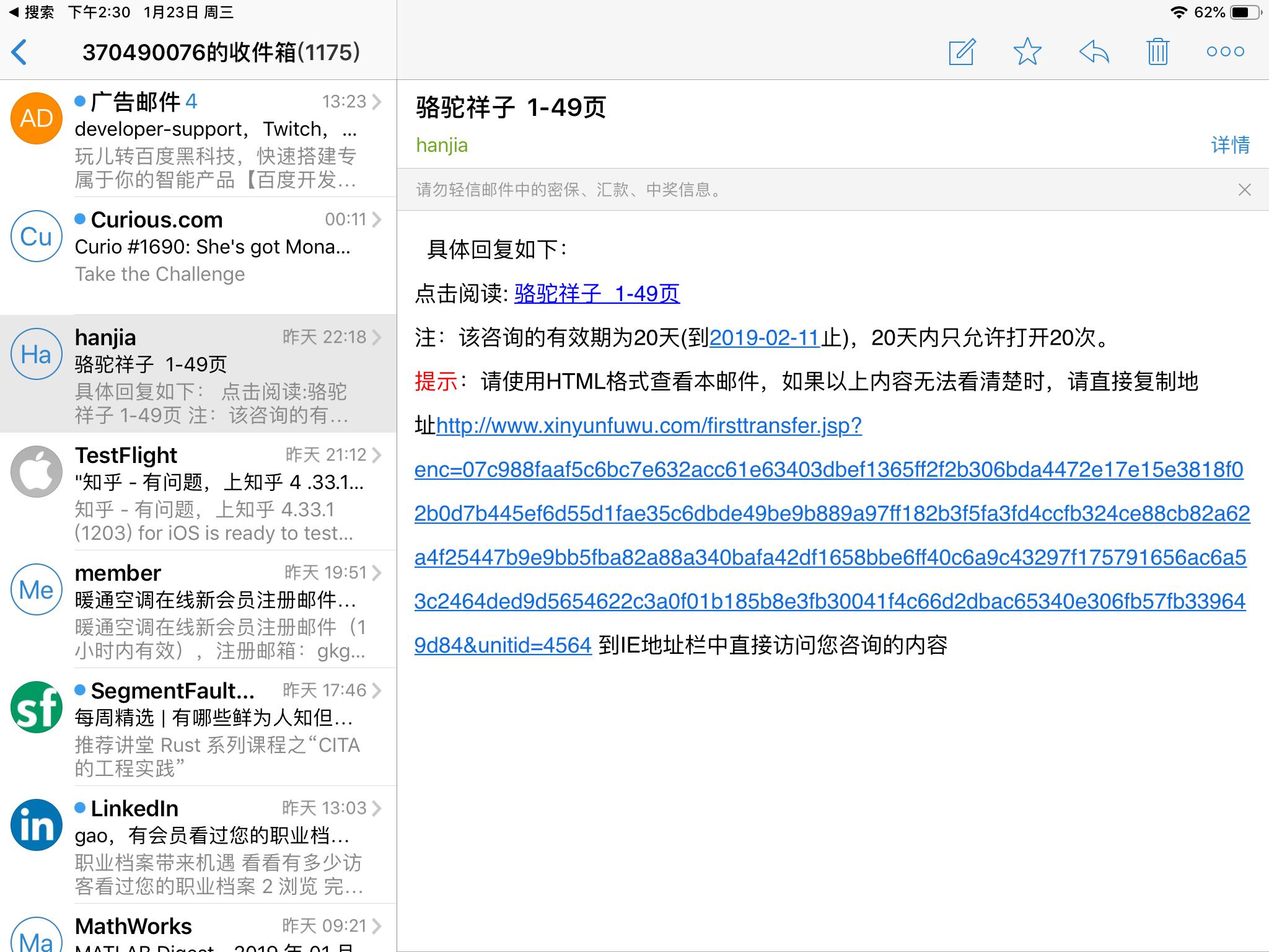 如果遇到没有下载项目,而又文献传递的东西,可以点击文献传递,输入你的邮箱和页数(一次49页 比如写1-49 第二次就可以50-99),一般很快就会在qq邮箱收到网址,点击之后找到pdf,分享到ipad的阅读软件上就可以观看了
