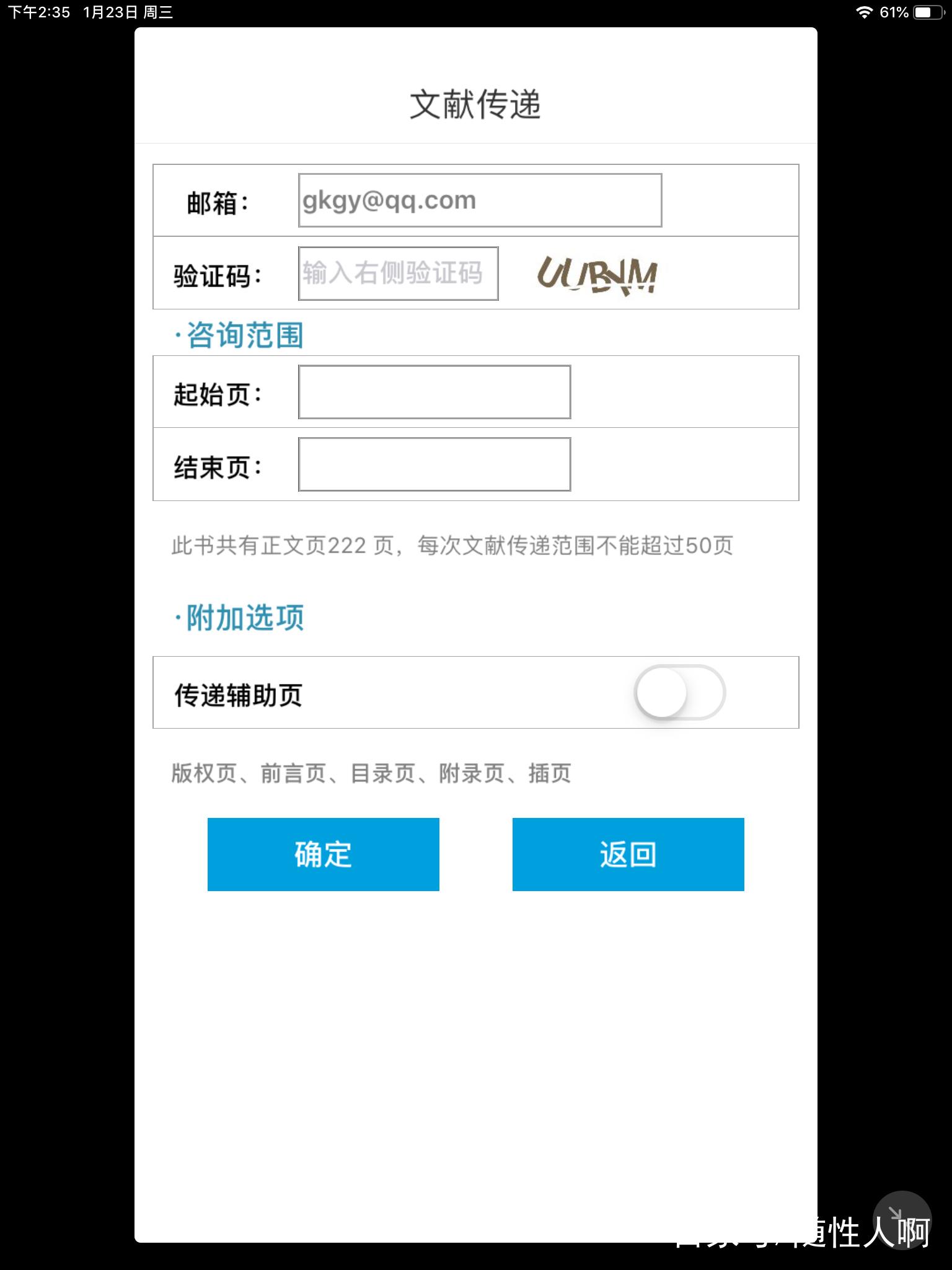 如果不能下载的就只能传递了。填入一个接收邮箱,以PDF扫描版发送。一次只能传递50页,一天只能传递一次。在邮箱中打开的效果说实在的不怎么好,将就着看看。