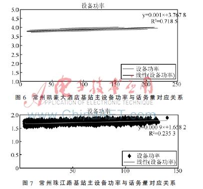 从图7可以看出,在两个基站的话务量与主设备功率之间都可以拟合出一条线性关系方程,尤其是凯豪大酒店的拟合度相当高,充分说明它们之间是存在线性相关的关系。
