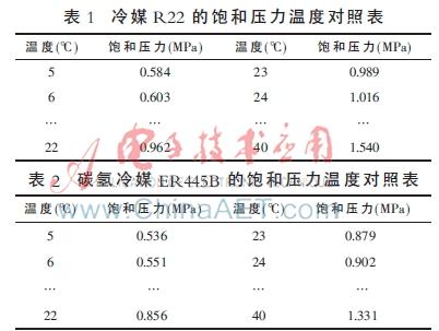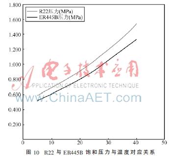 从表2可以统计出,在5℃~40℃,R22冷凝压力对应每℃的变化率平均值在2.81%。ER445B冷凝压力对应每℃的变化率平均值在2.57%。需要注意的是这里用的是相邻两个温度点之间的相对变化率。