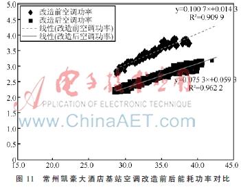 空调的功率是随外界温度变化而显著变化的,空调其实并不存在一个稳定的静态功率或者效率数据值,而是对应某个特定工况下(基站主要就是外界温度)下,都有一个相对稳定的功率或者能效比值。正是基于这种思路,本节能效果测试方案就是改造前持续采集3个月,每个基站都采集了约13万条记录,每条记录都包含了外界温度、设备、空调能耗参数等37个数据。改造后则一直持续测量采集。然后依据改造前后不同外界温度下空调的功率和能效比数据做拟合关系方程,从离散的点图归纳出明确的量化程式,并以此为基础来确定改造前后的每个外界温度条件下的节能效率。以凯豪大酒店基站为例,对比分析改造前后基站空调的能耗数据如图11所示。