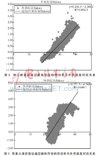 图8和图9中横轴是机房室外温度,纵轴是单位时间内传导的热量,其中正值表示通过墙体向机房内传热,负值表示通过墙体向机房外散热。热传导方向切换点两个基站都在25℃左右,与实际情况完全吻合,而且拟合曲线的拟合度非常高,这从统计学上也反过来印证了我们的计算方法是科学、严谨的,采集的基础数据也是准确的,分析过程中用到的相关推导公式也是合理的。