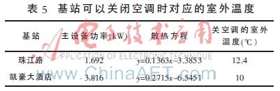 利用上述两幅图所呈现出来的统计数据,可以推导出两个基站在什么情况下就可以关闭空调电源(当墙体散热等于主设备热负荷的时候),如表5所示,利用墙体自然散热就可以满足机房环境要求。