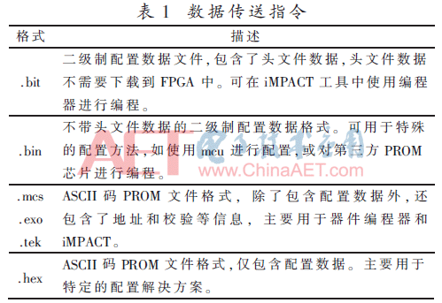 XILINX设计工具(PROMGen)可生成多种格式的配置数据文件,这些数据文件可以存储在PROM中,也可以存储在其他非易失性存储芯片中[4]。配置文件的常用格式见表1。