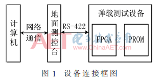 设备的系统连接框图如图1所示,设备通过RS-422接口与地面测控台连接,地面测控台通过网络通信接口与计算机连接。测试设备的主控芯片FPGA为XILINX公司的Virtex-4系列XC4VSX35芯片,PROM配置芯片型号为XCF32PFSG48C,存储容量32 Mbit[3]。