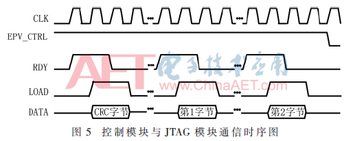 图5中,控制模块将EPV_CTRL信号置高,等待RDY信号有效,当检测到RDY信号为高后,将LOAD信号置高,同时将数据放在DATA线上,下一个CLK周期检测到RDY变为低,则延迟一个周期,在下下个周期将LOAD信号置低,LOAD信号和DATA线上数据至少保持2个CLK周期(注:DATA数据线上传送的第一个字节为CRC校验值,相关说明见2.8节)。