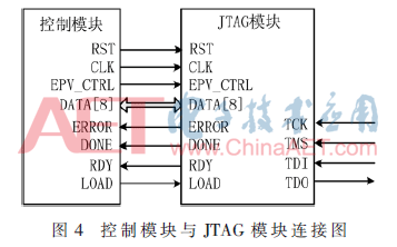 (2)编程:擦除操作成功后,JTAG模块将RDY置高,表示该模块已经准备好接收编程数据,控制模块将LOAD置高,同时把数据送到DATA线上,同一个时钟的下降沿,JTAG模块锁存数据,下一个时钟上升沿,JTAG模块将RDY置低,再下一个时钟上升沿,控制模块将LOAD置低。因JTAG模块需要将数据按位串行移到PROM,所以控制模块发完数据后,至少需要等8个周期才能发送下一字节数据,发送新的数据前需要首先监控RDY信号的状态。