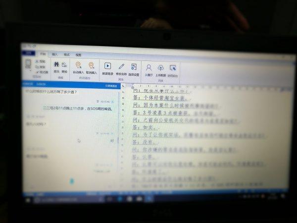 早上9点半不到,姜琪准备好了各种文书材料,提前下楼到远程提审室准备提审。此时的远程提审室,各项设备已经“就位”。姜琪座位面前,一台电脑,旁边一个黑色话筒。打开电脑桌面上的讯(询)问笔录系统图标,电脑桌面出现的就是智能语音识别系统界面:界面分左右两个文本框,左边是记录并转换语音为文字的素材窗口,右边则是讯问笔录的编辑窗口。从不远处墙上的显示屏可以看到,嫌疑人也已经在位置上坐好,准备接受讯问。他的面前,也有一个话筒。