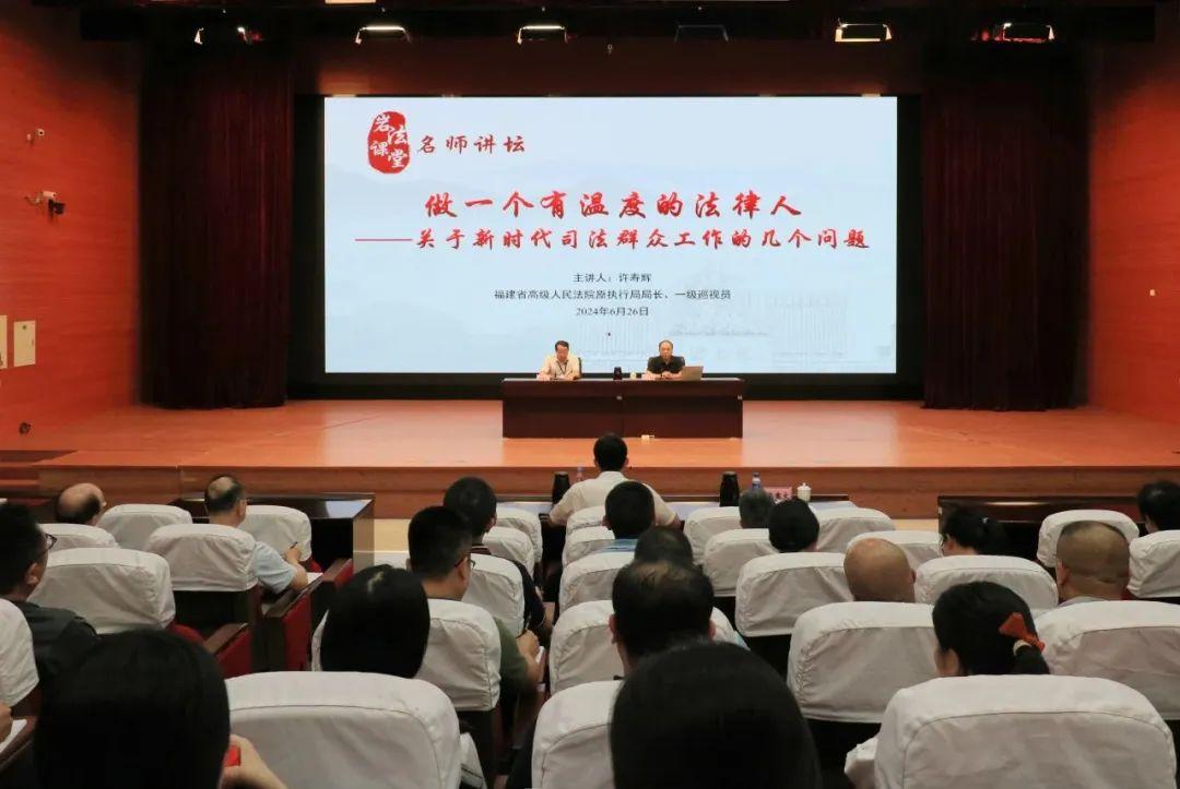 6月26日,龙岩中院邀请省法院原执行局局长、一级巡视员许寿辉同志以《做一个有温度的法律人——关于新时代司法群众工作的几个问题》为题开讲“岩法课堂·名师讲坛”。龙岩中院党组书记、院长陈明聪,在家领导班子成员、干警在主会场参训;各基层法院及龙岩法院对口支援的新疆呼图壁法院、西藏边坝法院干警通过“岩法课堂”云平台同步线上直播收看。