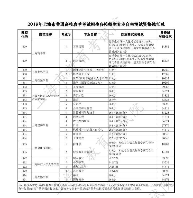 6. 2019年上海市普通高校春季考试招生各校招生专业自主测试资格线汇总