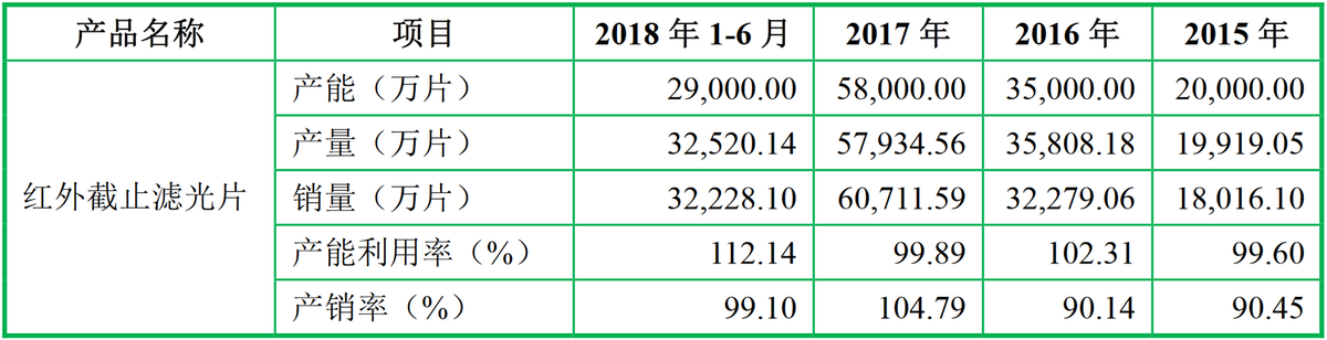 以红外截止滤光片为例,2015年至2018H1,公司的产能传哪个2亿片攀升到2.9亿片(全年为5.8亿片),但是产能利用率分别为99.6%、102.31%、99.89%和112.14%。销量也一直保持在90%以上,持续满产满销。(见图一)