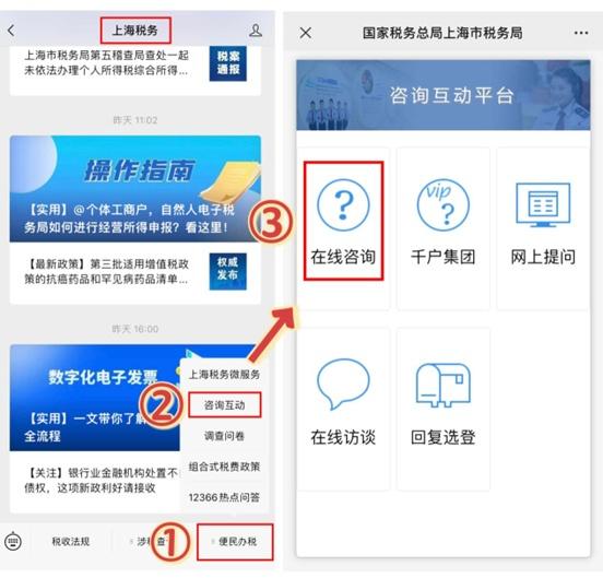 方式一:通过【上海税务微信公众号】——【便民办税】——【咨询互动】即可进入智能咨询。