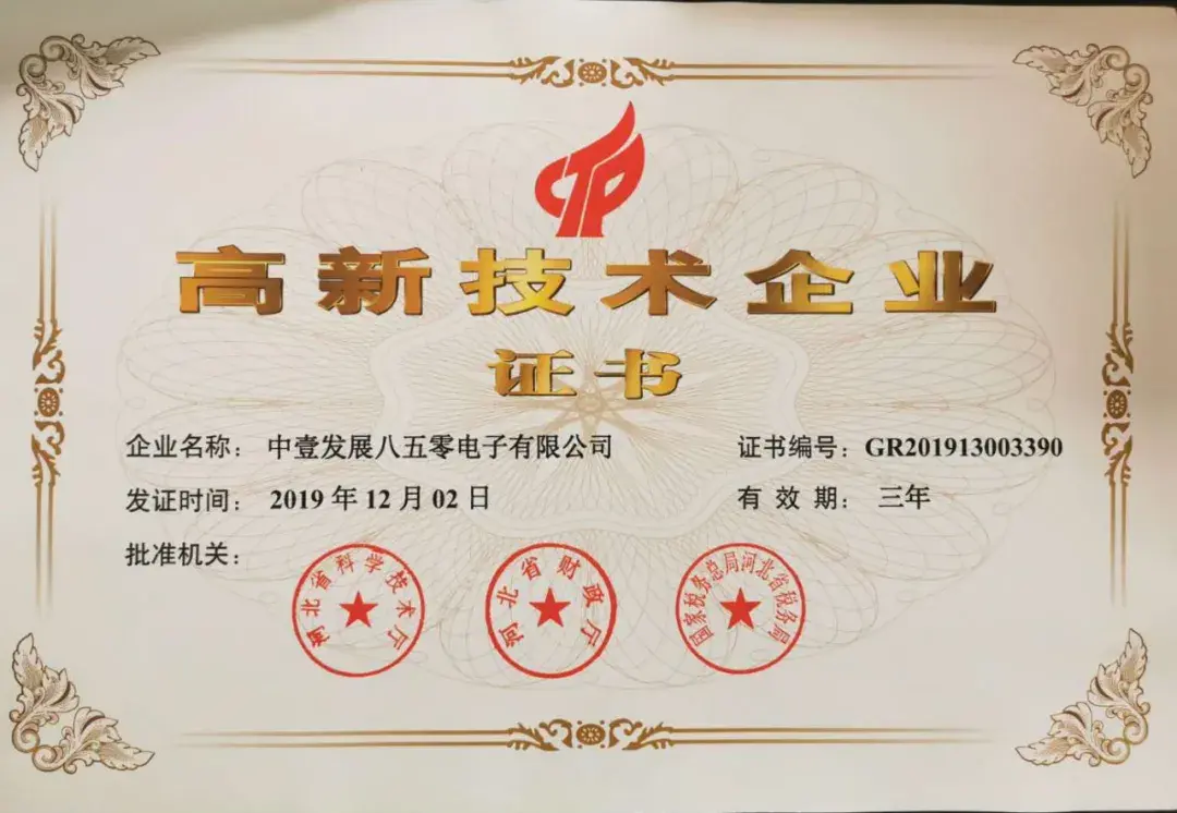 中壹发展八五零电子有限公司,是我国军用电子元器件生产的国家级高新骨干企业,是河北省唯一一家研发生产军用、民用电连接器、开关的专业化生产企业,军民融合型企业,注册资金1.2亿元,现有员工500余人。公司是始创建于1966年的国防三线军工企业是国内本行业中生产历史较长、规模较大、技术研发力量雄厚的企业之一。
