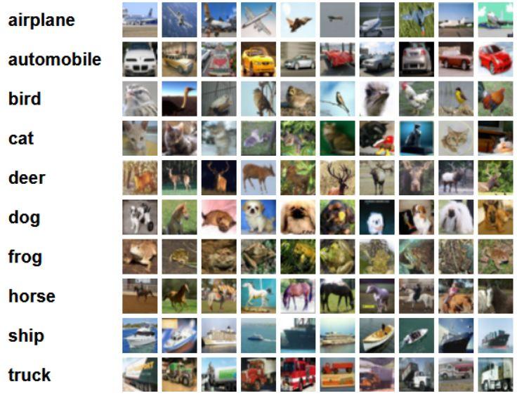 图1-2a展示了一个由彩色图像组成的、分类的数据集Cifar10,其中有飞机、汽车、鸟、猫、鹿、狗、青蛙、马、船、卡车10个类别,且每个类别中都有1000张32×32的彩色图片。图1-2b展示的是不同算法在Cifar10数据集上的分类效果。