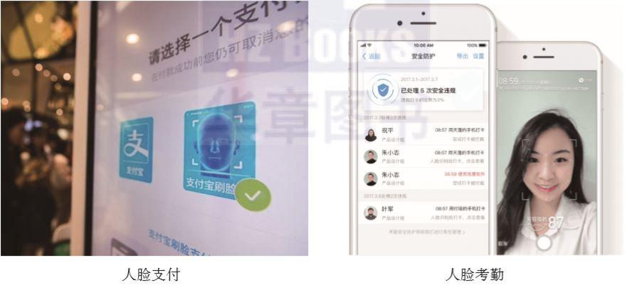 人脸支付: 将人脸与用户的支付渠道绑定,支付阶段即可刷脸付款,无须出示银行卡、手机等,提高支付效率(如图1-3)人脸开卡: 客户在银行等部门开卡时,可通过身份证和人脸识别进行身份校验,以防止借用身份证进行开卡人脸登录: 用户注册阶段录入人脸图片,在安全性要求较高的场景中启动人脸登录验证,以提高安全性VIP人脸识别: 通过人脸识别自动确定客户的身份,提供差异化服务人脸签到: 活动开始前录入人脸图片,活动当天即可通过刷脸进行签到,提高签到效率人脸考勤: 利用高精度的人脸识别、比对能力,搭建考勤系统,提升考勤效率,提高防作弊能力(如图1-3所示)人脸闸机: 在机场、铁路、海关等场合利用人脸识别确定乘客身份会员识别: 会员到店无须出示会员凭证,只要刷脸即可完成会员身份验证,实现无卡化身份确认和人流统计安防监控: 在银行、机场、商场、市场等人流密集的公共场所对人群进行监控,实现人流自动统计、特定人物的自动识别和追踪相册分类: 通过人脸检测,自动识别照片库中的人物角色,并进行分类管理,提升产品的用户体验人脸美颜: 基于人脸检测和关键点识别,实现人脸的特效美颜、特效相机、贴片等互动娱乐功能▲图1-3 人脸识别应用场景