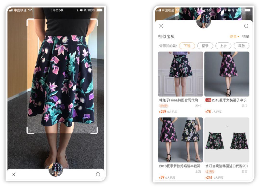 这里列举一个图像搜索的例子:拍立淘。拍立淘是手机淘宝的一个应用,主要通过图片来代替文字进行搜索,以帮助用户搜索无法用简单文字描述的需求。