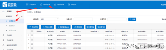 3、登录后,在首页点击“销项管理--云开票--查询统计--发票查询”,可以勾选需要下载的发票点击电子票下载。