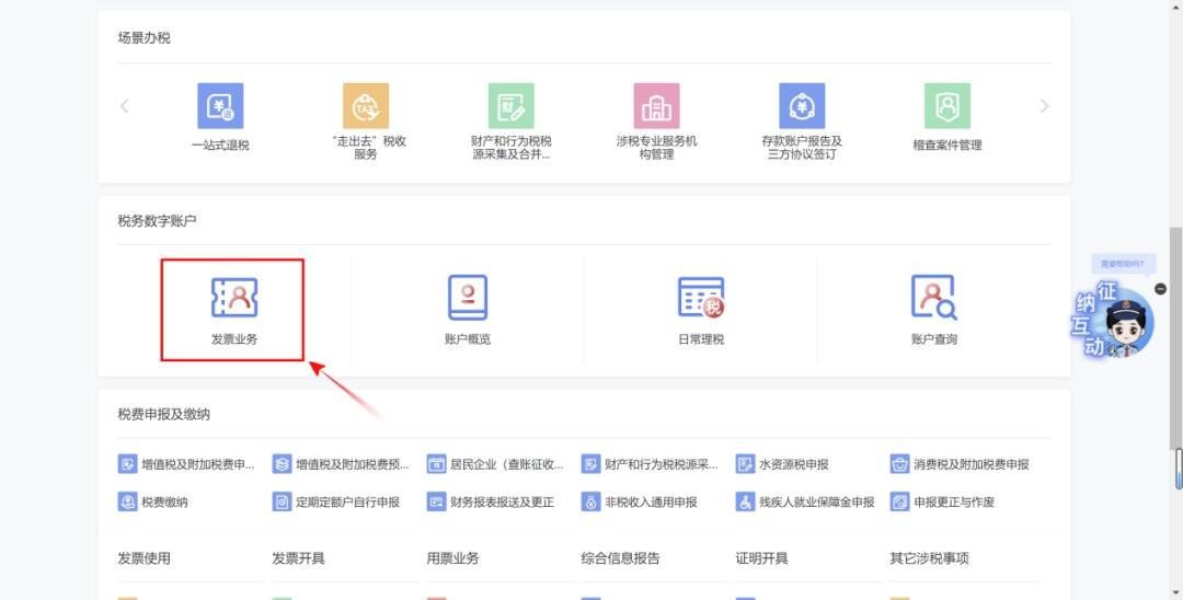 登录全国统一规范电子税务局(以下简称“新电子税局”),滑动页面至【税务数字账户】部分,选择【发票业务】即可登录电子发票服务平台。