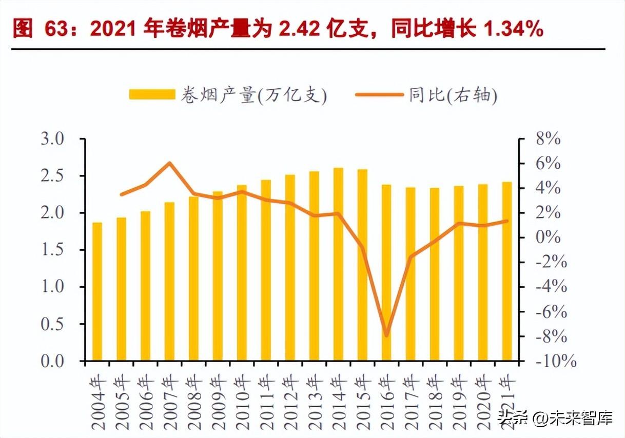 铝箔在包装领域应用广泛,主要包括烟草包装、食品包装、药品包装、啤酒封标以及 日化包装。根据中研网数据,用于烟草包装的铝箔占包装用铝箔总量的 36%,食品包装 占 25%,药品包装占 24%,烟草包装是最主要的应用领域。 中国卷烟产量在 2020 年和 2021 年重回正增长。在 2014 年以前,随着人口基数的扩 大以及经济增长,我国卷烟产销量逐年增加,并在 2014 年达到峰值。但随着人们健康意 识的提升、烟草行业调控以及卷烟消费税政策调整等,卷烟消费市场环境发生变化,2015 年以来全国卷烟产销量大幅下降,卷烟产量由 2014 年峰值的 2.61 万亿支下降至 2018 年 的 2.34 万亿支,2019 年起全国卷烟产量逐年小幅回升,2020 和 2021 年全年卷烟产量分 别为 2.39 万亿支和 2.42 亿支,同比分别上升 0.94%和 1.34%。