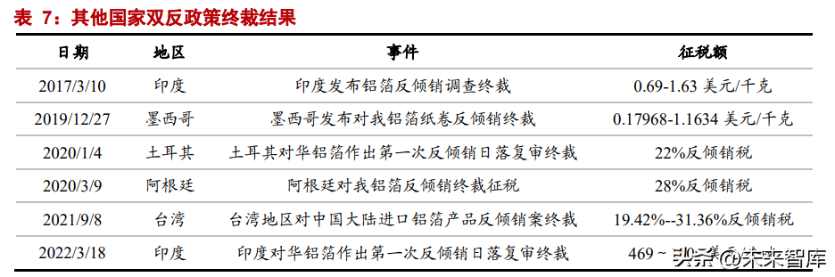 综合以上数据可以看出,双反政策虽然当期短期造成出口影响,但是并未我国出口造 成长期影响,负面作用已经消化。但是疫情以来海外通胀严重,造成产品内外价差加剧, 我国产品仍具有明显价格优势。在此背景下,海外取消双反关税的意愿强烈,铝箔有望受 益。