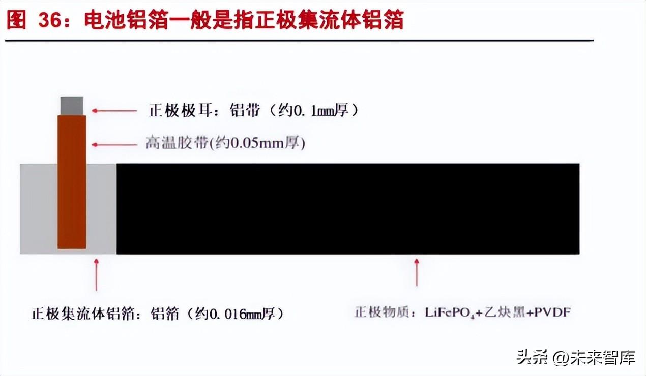 锂离子电池用铝箔分为:锂电池正极集流体用铝箔、锂电池外包装铝塑膜用铝箔、 极耳用铝箔。通常所说的电池铝箔,是指锂电池正极集流体用铝箔。电池正极箔一方面是 集流体电极,另一方面又是锂电池正极材料的载体,也就是锂电材料要涂布其上。 电池铝箔是锂电池生产的重要原材料。正极由正极极耳、高温胶带、正极集流体铝 箔和正极材料组成,正极集流体铝箔厚约 0.016mm。