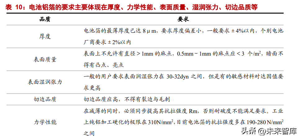 高端动力电池的正极集流体铝箔的技术含量较高。集流体用铝箔以 1060、1070、1100、 1235、3003 等型号合金为主,主流厚度规格是 10-20μm,部分电池生产厂家用到 8μm, 未来的方向是继续减薄,甚至可能减到 6μm。与此同时,电池厂对强度的要求却更高, 因此电池正极铝箔的生产并不是想象的那么简单。