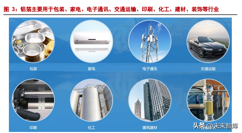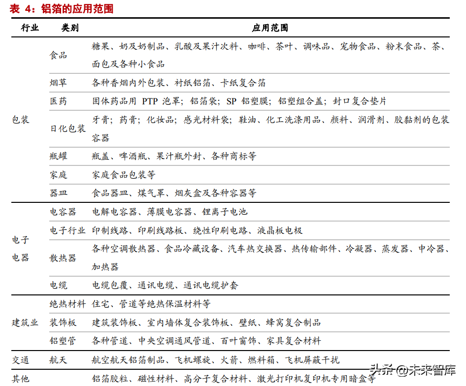 铝箔的应用范围主要包括包装、电子、电器、建筑、交通等。包装铝箔应用于食品、 烟草、日化包装、瓶罐、家用、器皿等;电子电器铝箔主要应用于电容器、锂电池、印刷 电路、液晶板电极、空调散热器、汽车热交换器、电缆包覆等;在建筑业中,铝箔被用作 绝热材料、装饰板、蜂窝复合制品、百叶窗、通风管道等。航空航天中也会用到铝箔,比 如各种飞机螺旋桨、燃料箱、信号屏蔽装置等等。