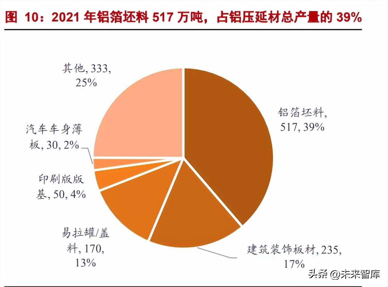 2021 年,剔除铝箔坯料后的铝加工材产量为 3953 万吨,比上年增长 5.8%。其中占 比最大的是挤压材,达到 2202 万吨,挤压材分为铝型材、铝管材、铝棒材铝型材占绝大 多数,铝型材又可分为工业铝型材和建筑铝型材。 铝加工材第二大类别是铝压延材,包括铝板、铝带、铝箔,合计占比 32%,2021 年 产量 1273 万吨。其中铝箔坯料 517 万吨,占比达到 39%,其次下游行业有:建筑装饰板 材 235 万吨、易拉罐/盖料 170 万吨、印刷版版基 50 万吨、汽车车身薄板 30 万吨,以及 其他产品 333 万吨。