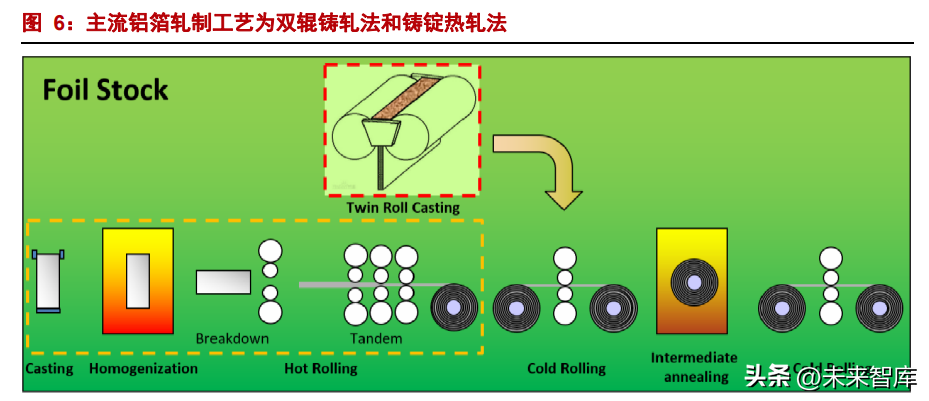 铝箔加工流程是铝加工工业中加工工序最多、厚度最小、难度最大的铝材产品。目前 行业内有两种常用的加工工艺路线: (1)铸锭热轧法;(2)双辊式铸轧法。 (1)铸锭热轧法:首先将铝熔体铸成扁锭,再经过均匀化、热轧、冷轧、中间退火 等工序后,继续冷轧成厚度约为 0.4~1.0 mm 的板材作为箔材坯料(熔铸→热轧开坯→冷 轧→箔轧)。 (2)双辊铸轧法:与铸锭热轧法相比,铸轧法生产铝箔坯料的工艺流程相对较为简 单;不需要经过熔炼铸锭、铣面、均匀化和热轧等复杂的工艺步骤,而是将铝熔体直接倒 入两个旋转的铸轧辊(结晶器),在铸轧区 2~3s 时间内同时完成凝固和热轧两个过程,获 得厚度为 4~7mm 的板材。类似于热轧铝箔坯料,铸轧板也需要经过一系列冷轧、中间退 火工艺,最终轧制成 0.3~0.7mm 厚的板材作为铝箔坯料。