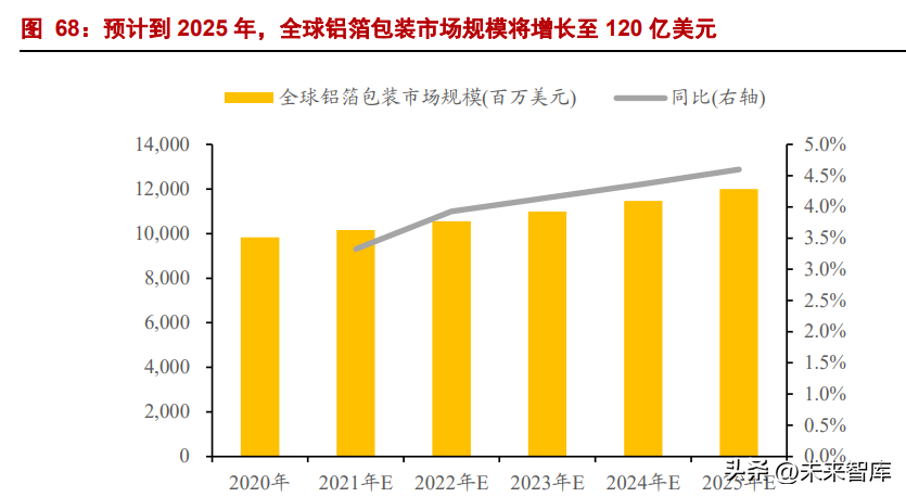 综合来看,2020 年全球铝箔包装市场规模达到 98.29 亿美元,预计到 2025 年,将增 长至 120.00 亿美元,五年 CAGR 约为 4.07%。根据 Infiniti Research 统计,2020 年全球 铝箔包装市场规模达到 98.29 亿美元,预计到 2025 年,将增长至 120.00 亿美元,五年 CAGR 约为 4.07%。