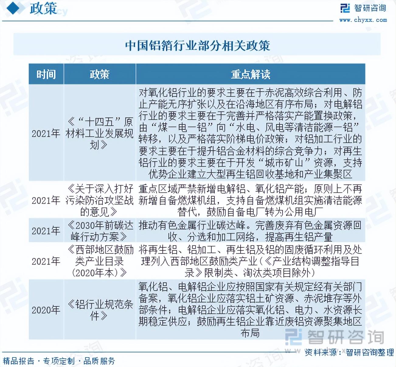 近些年,为了促进铝箔行业发展,我国陆续发布了一系列相关政策,支持、规范行业的发展,为行业创造了良好的政策环境。如《铝行业规范条件》中指出氧化铝、电解铝企业应按照国家有关规定经有关部门备案,氧化铝企业应落实铝土矿资源、赤泥堆存等外部条件;电解铝企业应落实氧化铝、电力、水资源长期稳定供应;鼓励再生铝企业靠近废铝资源聚集地区布局。