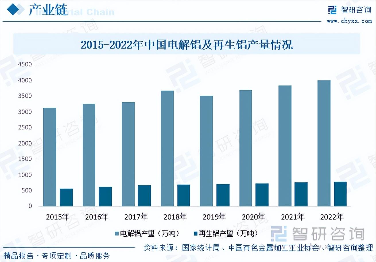 铝锭是电子铝箔主要原材料,目前,铝锭的来源主要有两种途径,一种是传统的电解铝行业,另一种是新兴的再生铝行业。近年来,在下游需求增长及制备工艺提升的带动下,我国电解铝及再生铝的产量也随之不断增长。据资料显示,2022年我国电解铝产量为4021.4万吨,同比增长4.4%;再生铝产量为782万吨,同比增长2.2%。