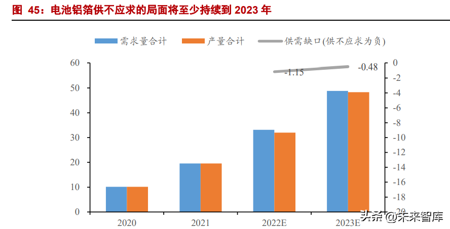 结合我们前述对需求方面的预测,我们认为 2022-2023 年电池箔总体供需仍然保持 紧平衡。由于国外暂未看到电池箔生产企业的扩产计划,在我们的预测中假设短期内国外 的电池箔产量保持不变。基于前述供需测算,我们预计 2022 年全球电池箔产量将达到 32.0 万吨,2023 年产量为 48.3 万吨;需求方面,2022 和 2023 年分别为 33.1 万吨、48.8 万吨。 因此,2022 年出现需求缺口 1.15 万吨,2023 年需求缺口 0.48 万吨,基本维持供需紧平 衡状态。直到 2024 年之后,电池铝箔供应放量,当前供需紧张的格局出现缓解。