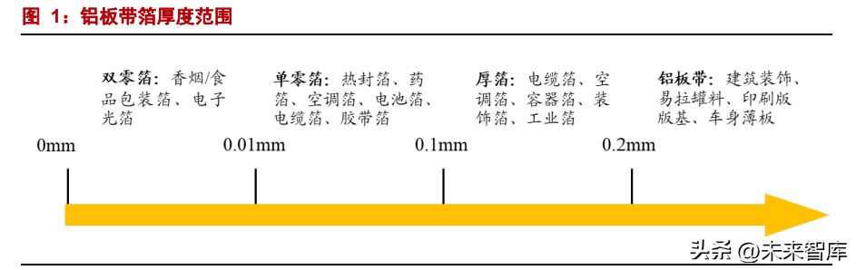 首先,按照厚度划分,铝箔可分为双零箔、单零箔和厚箔。双零箔是指,在其厚度以 mm 为计量单位时小数点后有两个零的箔(即厚度<0.01mm);同理,单零箔是指以 mm 为计量单位时小数点后有一个零的箔(0.01mm≤厚度<0.1mm);厚箔是指厚度介于 0.1mm 到 0.2mm 之间的铝箔。 不同的终端应用产品会有不同的厚度要求。通常来说,双零箔主要用于食品包装、香 烟包装、电子光箔等;单零箔用于部分食品包装、药品包装、电子电路信号屏蔽、空调箔 等;厚箔主要用于空调箔、容器箔、建筑装饰以及工业用途。