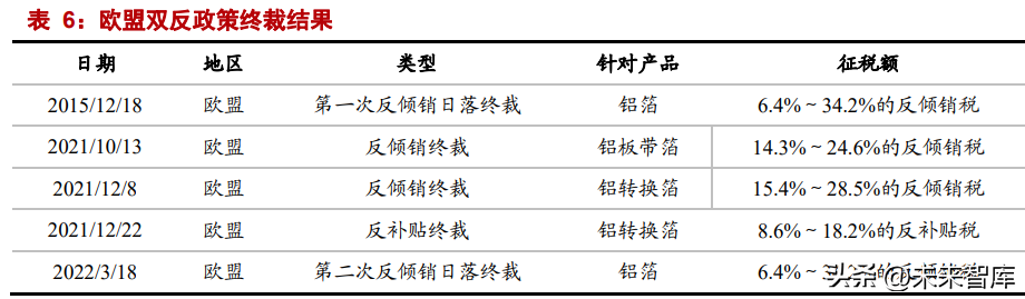 2021 年 10 月 11 日,欧委会裁定对中国企业征收的反倾销税率为 14.3%至 24.6%。但 鉴于欧盟部分企业提出暂停征税的请求,结合疫情影响下供需等市场条件发生变化,欧委 会决定暂停对该产品征收反倾销税,为期九个月。2022 年 5 月 25 日,欧盟决定不延长针 对中国进口铝轧制产品征收反倾销税的暂停期。在 2022 年 7 月 12 日以后,应恢复对中 国板带箔产品征收反倾销税。 2021 年 12 月 22 日,欧盟委员会发布公告,对中国涉案产品征收 8.6%~18.2%的反 补贴税,决定对原产于中国的厚度小于 0.021 毫米、无背衬、经轧制、重量超过 10 公斤 的铝转换箔产品征收 6.0%~28.5%的反倾销税(修改 2021 年 12 月 8 日的反倾销终裁结 果)。