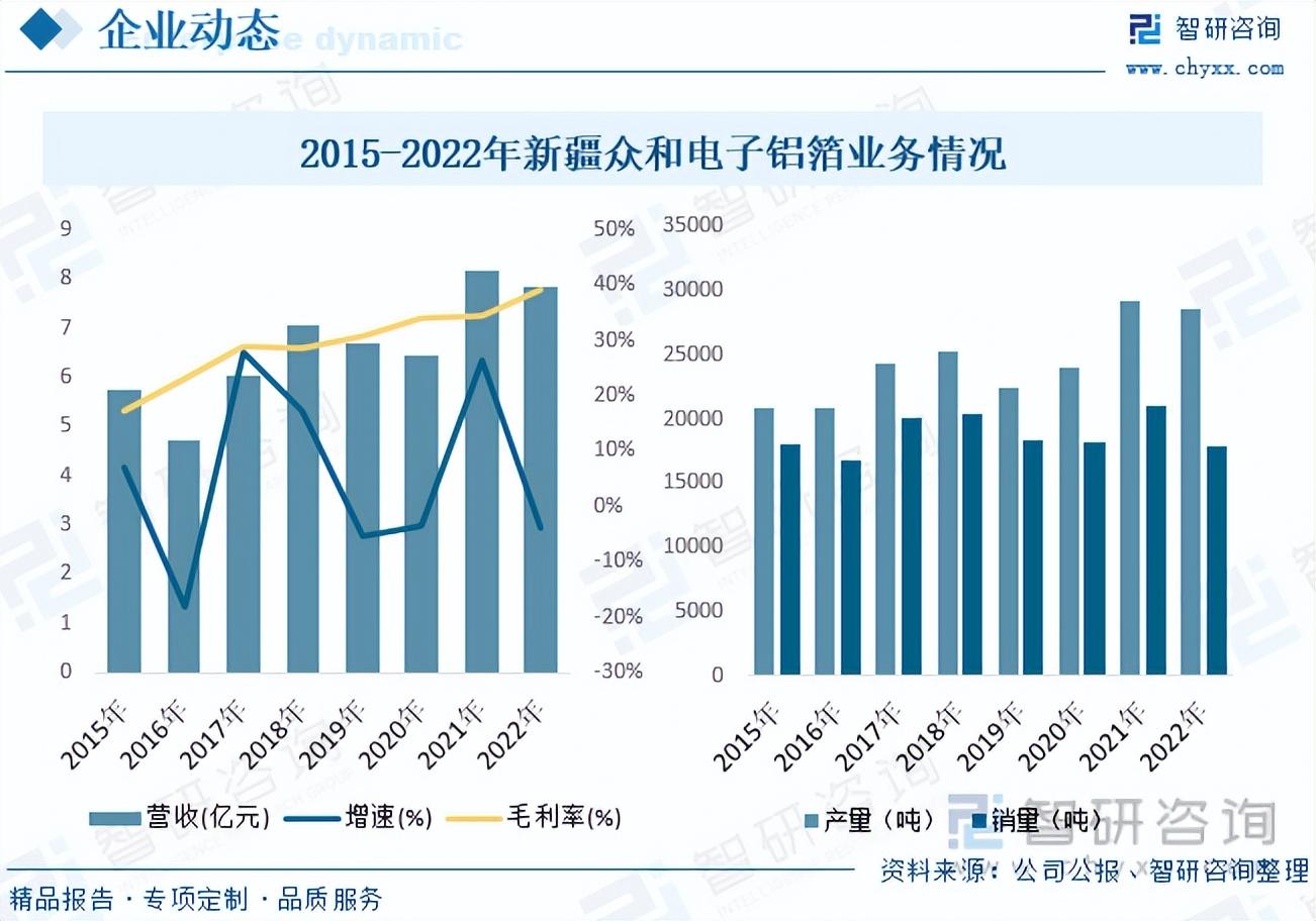 新疆众和股份有限公司的前身为新疆乌鲁木齐铝厂,始建于1958年,是国内领先的铝电解电容器用电极箔、电子铝箔的研发和生产基地。目前公司主要从事铝电子新材料和铝及合金制品的研发、生产和销售,主要产品包括高纯铝、电子铝箔、电极箔、铝制品及合金产品,形成“能源—(一次)高纯铝—高纯铝/合金产品—电子铝箔—电极箔”电子新材料循环经济产业链,生产过程环环相扣,上下游产品紧密衔接,是铝电子新材料行业中产业链最为完整的企业。据资料显示,2022年公司电子铝箔产量为28572.54吨,同比下降2.38%;销量为17867.2吨,同比下降15.36%;销售收入为7.86亿元,同比下降3.71%,毛利率为39.06%。