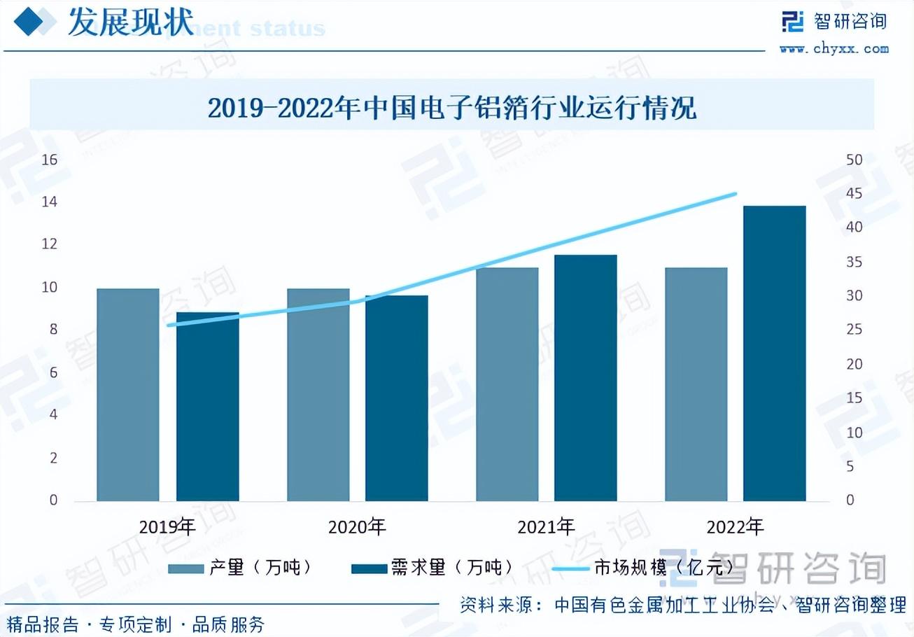 内容概况: 电子铝箔作为铝电解电容器的重要原材料,广泛应用于通讯、家电、汽车、电子、航空、新材料等领域,市场需求量极大。随着近年来我国经济的发展,在基础建设领域,对应用于工业电源、电力电子、通讯设备等的电容器需求大幅增长,进而带动了我国电子铝箔行业的快速发展,行业规模持续扩张。据资料显示,2022年我国电子铝箔行业市场规模约为45.1亿元,同比增长20.9%;电子铝箔产量为11万吨,较上年持平,需求量约为13.9万吨,同比增长19.8%。
