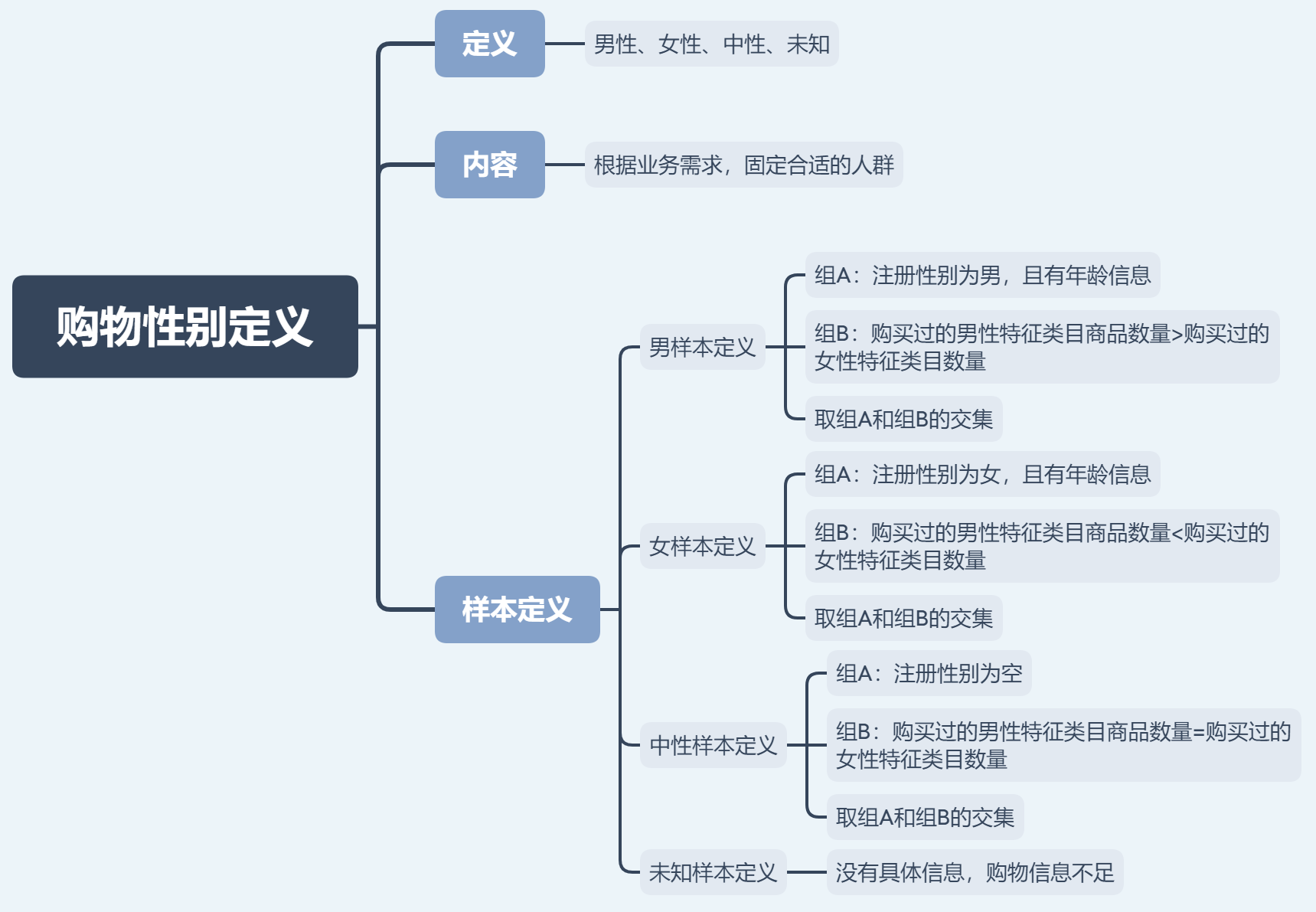以判断男性用户为例,我们需要综合其填写的信息与其订单数据,认为填写信息为男性且购买过的男性特征类目商品数量>购买过的女性特征类目数量的用户为男性用户。