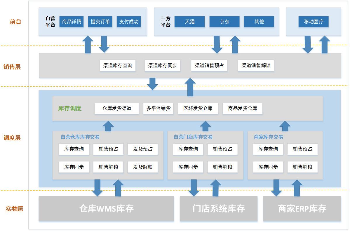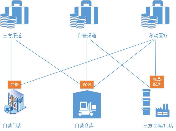 三方渠道: 主要为天猫,京东等三方平台,在相关三方渠道上开设店铺,并使用自营仓库进行电商订单的配送,使用自营门店进行自提业务;自营渠道: 自营渠道是指自营的商城,以直接提供商品购买服务为主;相关的订单主要由自营仓库进行配送,同时在签有代发货协议的前提下,部分商品可由代发货商家进行配送;移动医疗: 移动医疗属于公司的自营业务,以提供咨询服务为准,但同时客户可以选择相关商家购买货品,各个商家以入驻或代发货的方式接入,部分区域或部分货品由自营仓库配送或自营门店自提,其他的区域或货品则分别由商家提供配送或自提服务。1.2.2 库存体系相关业务背景