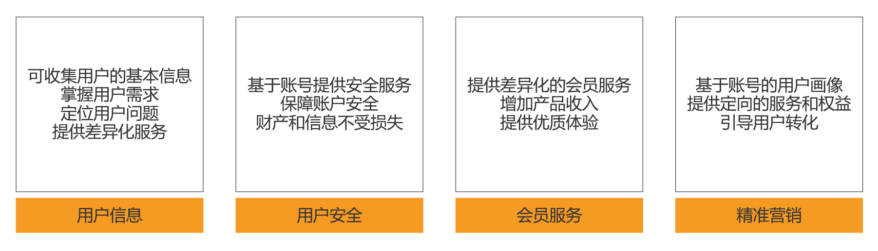 在电商产品中,用户账号是能唯一代表真实用户的载体,用户账号中记录了用户的一系列信息,包括用户基本信息、交易数据、行为数据等。我们可以据此分析用户,进而进行精细化、个性化的运营,为用户提供精准的服务。