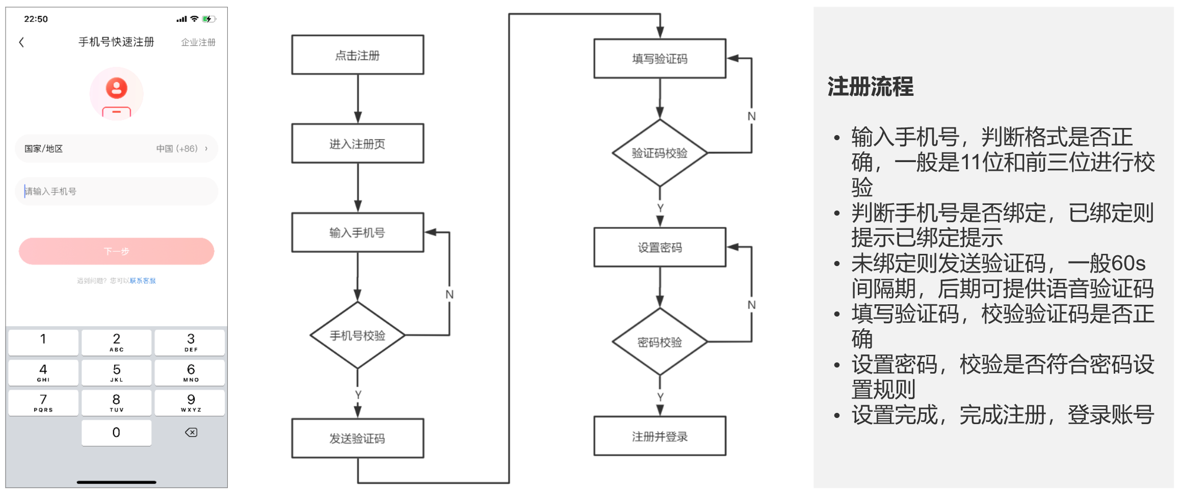 首先是手机号注册登录流程,这部分的重点在于对手机号格式的校验,校验通过并完成密码设置后即完成了账号的注册与登录流程。