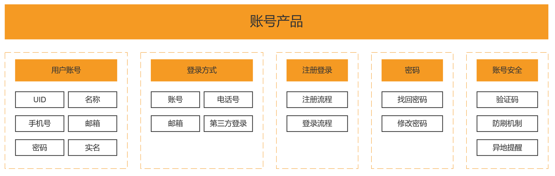账号:用户注册的账号,如QQ号、自定义的字符串、手机号、邮箱等,不可更改。UID:后台记录用户唯一身份的id,不会展示给用户。昵称:展示在前台的名称,可更改。头像:账号唯一的头像,可更改。邮箱:UID绑定的有效邮箱,唯一,可更改。手机号:UID绑定的有效手机号,唯一,可更改。密码:账号的唯一密码,可更改。实名信息:用户真实姓名、身份证、性别等,不可更改。账号产品内包含了用户账号、登录方式、注册登录、密码、账号安全的相关流程与内容。